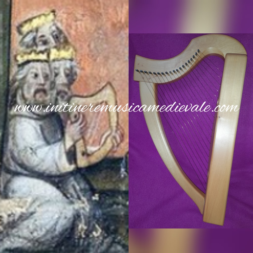 Nell’immagine qui sotto: arpa gotica a 21 corde di liuteria italiana, in legno di acero, dotata di uncini e realizzata su modello delle arpe più diffuse nell’Europa di fine XIV e inizio XV secolo.