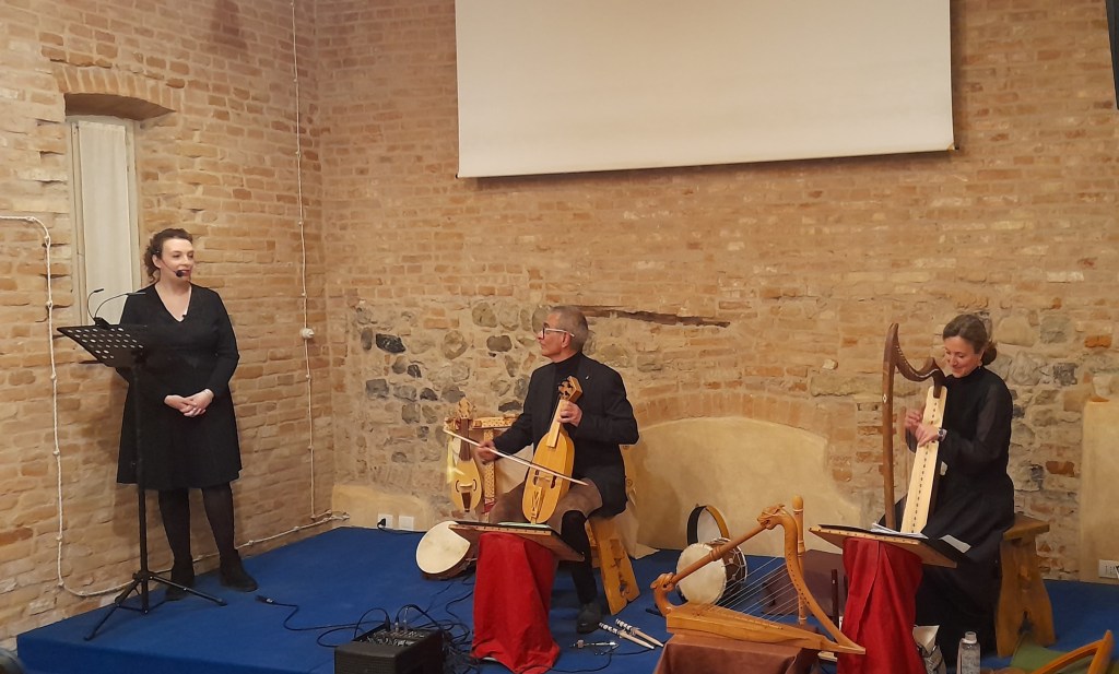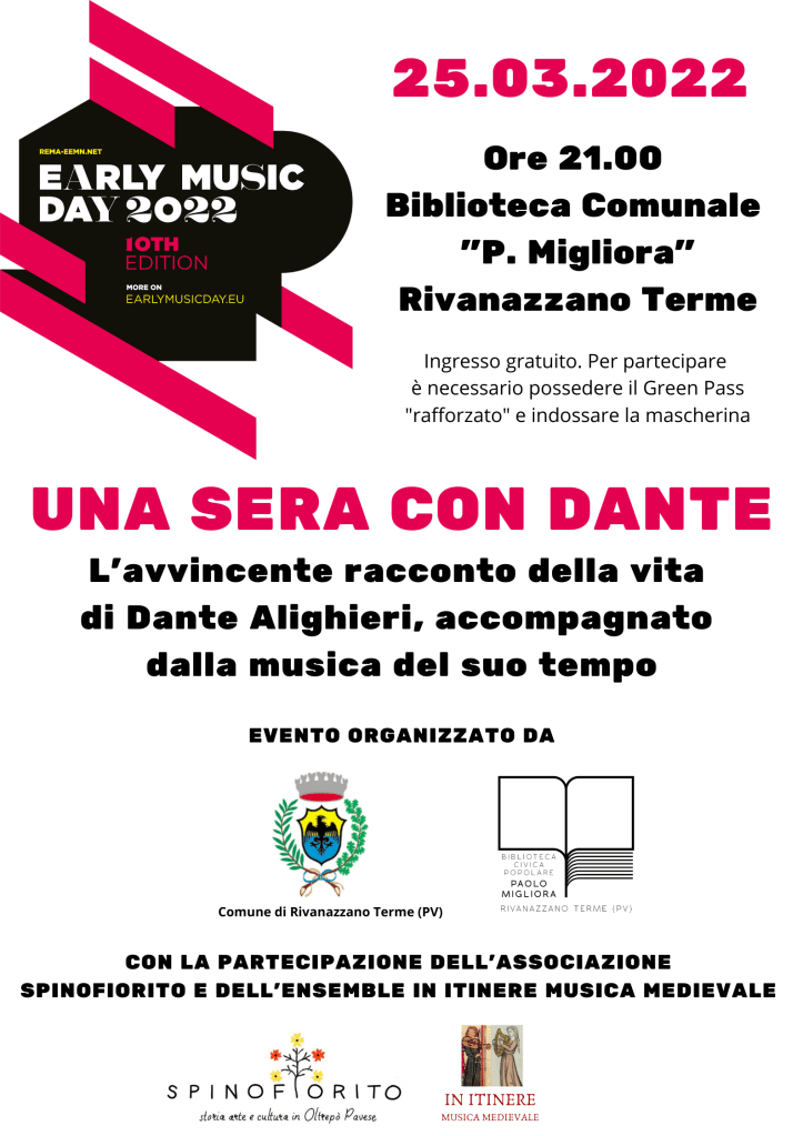 Un recital di brani tratti dal libro “Biondo era… e bello” di Mario Tobino per narrare la vita di Dante Alighieri in modo avvincente, con il dolce e affettuoso Dante bambino che lascia spazio all’intensità del giovane politico fiorentino, per poi evolversi definitivamente nel grande letterato. Il racconto della vita del Poeta a cura di Sara Sacchi è accompagnato dalle musiche del suo tempo, interpretate dal duo In Itinere Musica Medievale con molteplici strumenti di liuteria storica: flauti, arpe, viella, ribeca, lira ad arco, tamburo a corde, citola e percussioni.