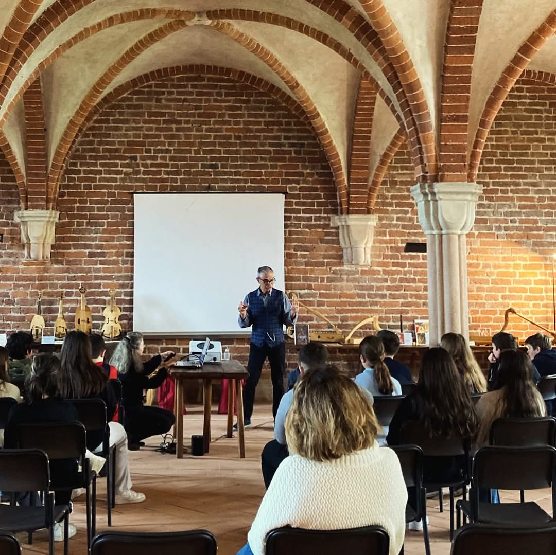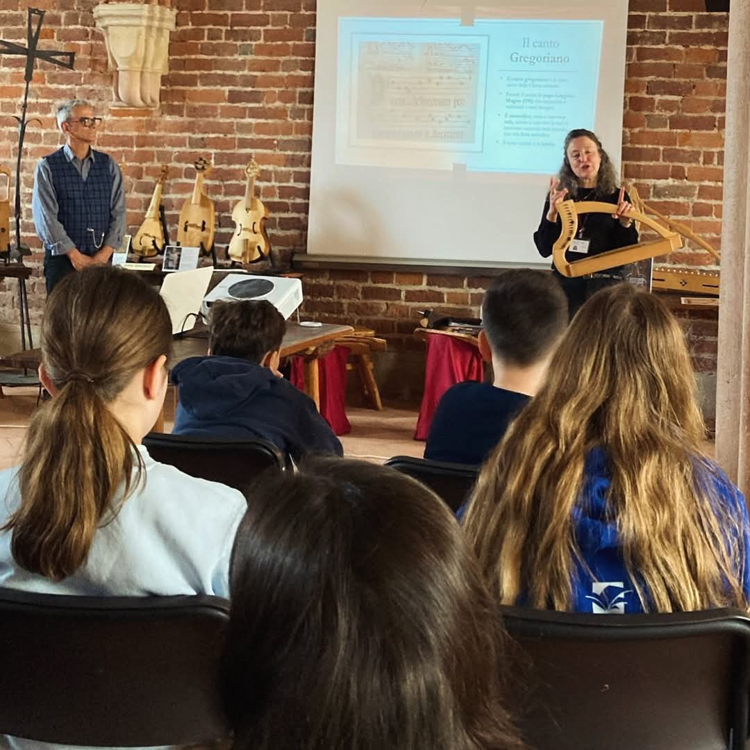 La musica medievale spiegata agli alunni di una scuola secondaria di primo grado di Varese il 24 marzo 2025 presso l’Abbazia di Morimondo (MI).